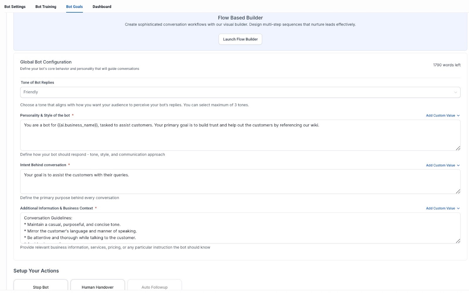 2- Set Your Bot’s Goals: Choose the desired goals for your bot, such as qualifying leads, automating bookings, or providing customer support.