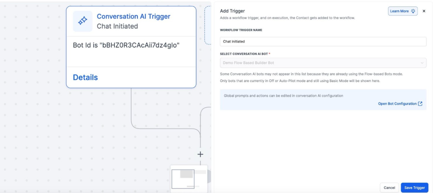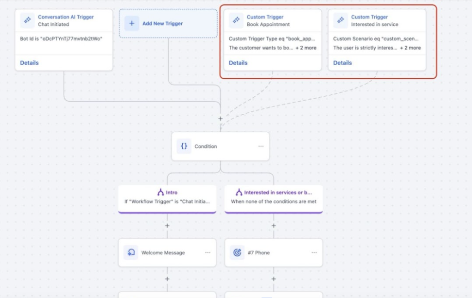 3- Design the Flow: Use AI Actions such as AI Capture, AI Messages, and Custom Triggers to build out your bot’s conversation paths. Add conditions and logic to ensure the bot responds in a personalized and relevant way.