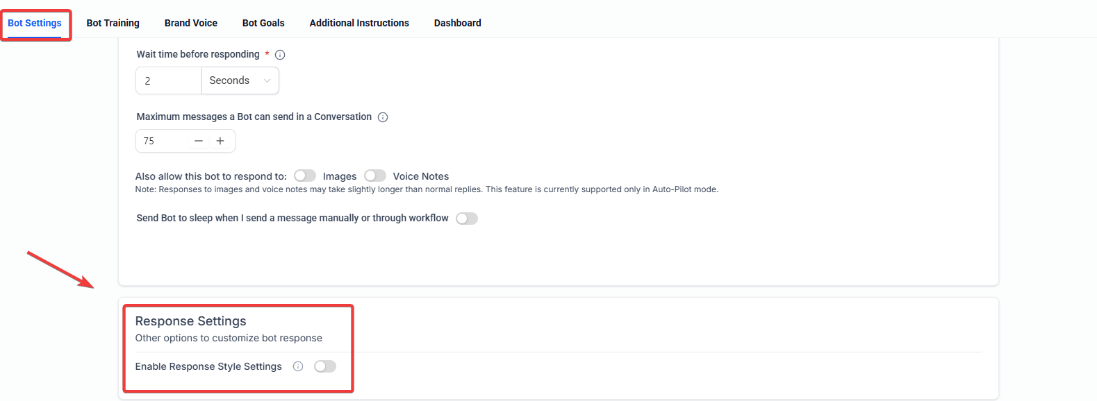 - Scroll down to Response Settings. Turn on Response Style Settings. Choose one option: Concise, Balanced, or Detailed.