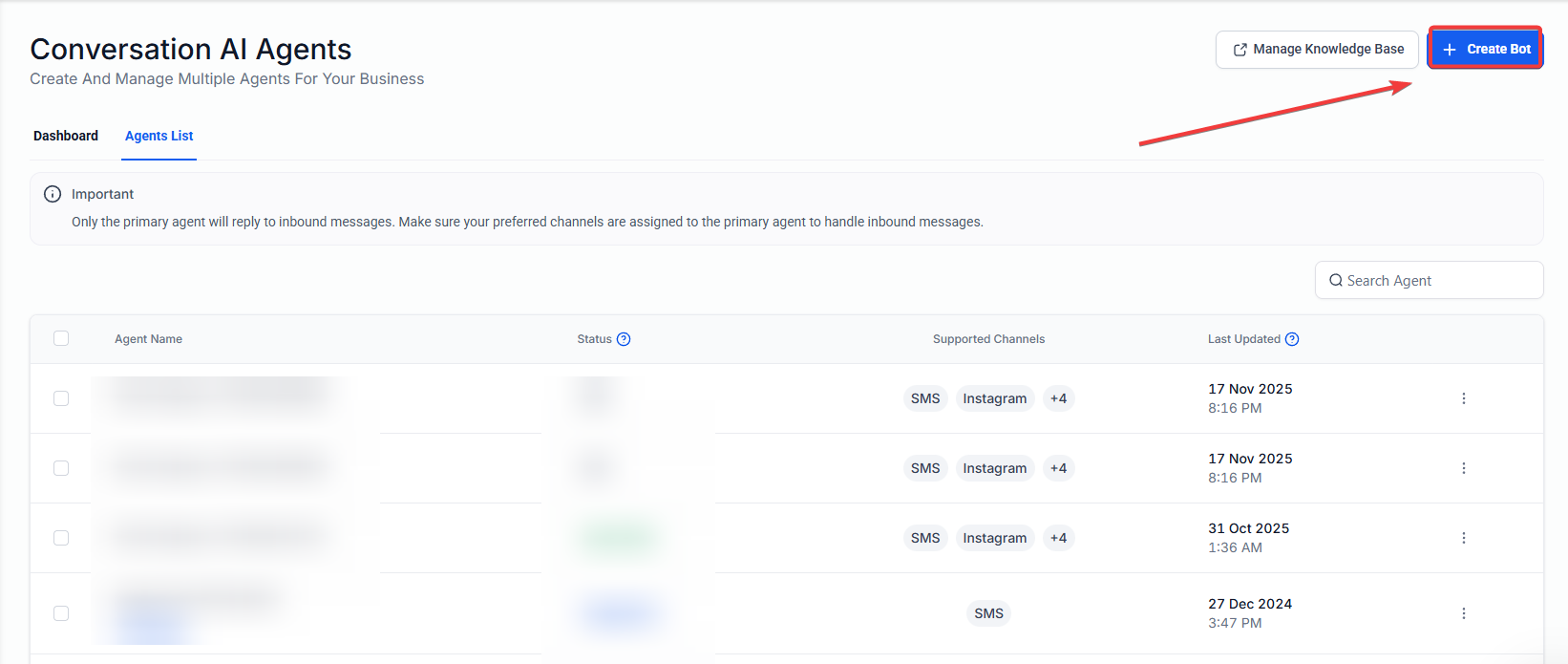 Navigate to Conversation AI > Bots and click Create Bot. You can navigate to Conversation AI either by navigating to Settings > Conversations AI, or from your account dashboard, you can navigate to AI Agents > Conversation AI.