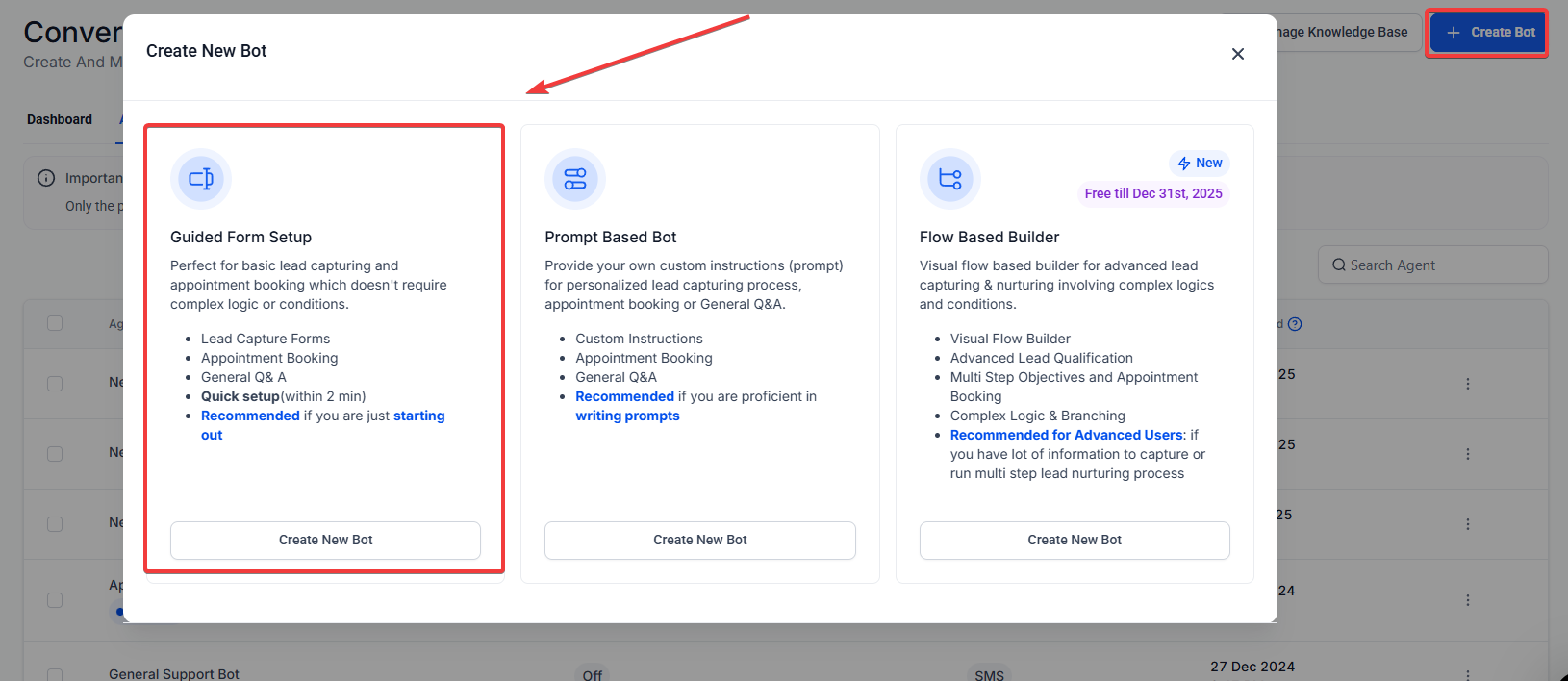 The Guided Form Bot is a powerful tool that allows you to easily create high-performing bots in Conversation AI. Whether you’re looking to capture leads, book appointments, or collect data, this feature streamlines the process by providing a structured, form-based setup. Best of all, it requires no advanced prompt-writing skills, making it ideal for users of all levels.