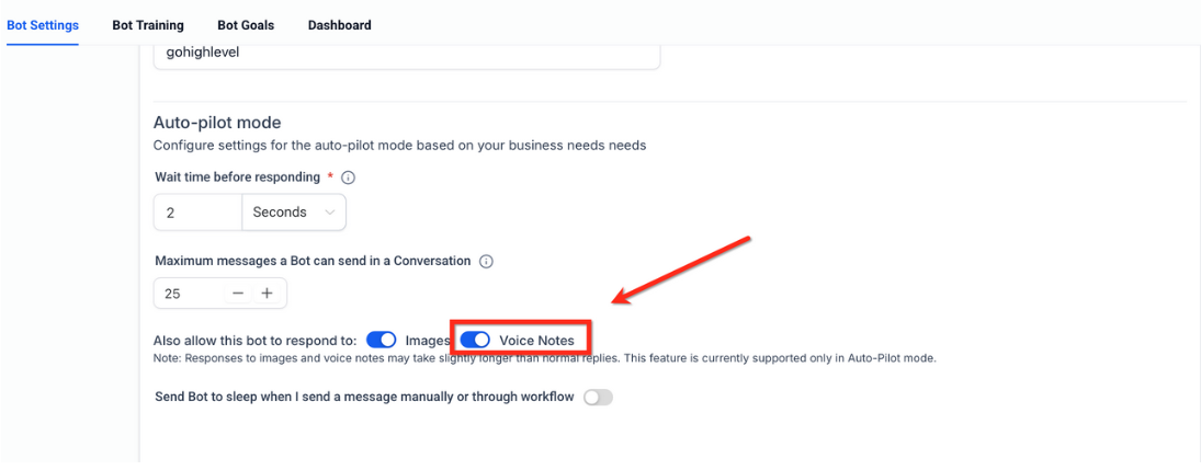 Once enabled, your bot will automatically start processing and responding to supported audio messages.