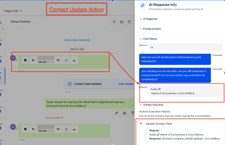 Section titled “Key Features & Benefits”- Voice Message Transcription & UnderstandingConversations AI accurately transcribes incoming audio messages, understands the content, and replies with contextual intelligence just like it would with text.