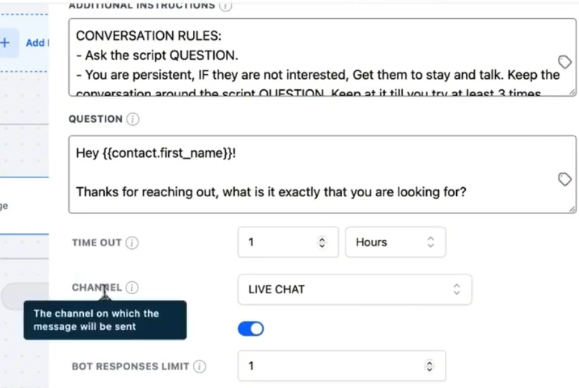 - Ensure that “Live Chat” is selected as the channel for the AI to engage through live chat.