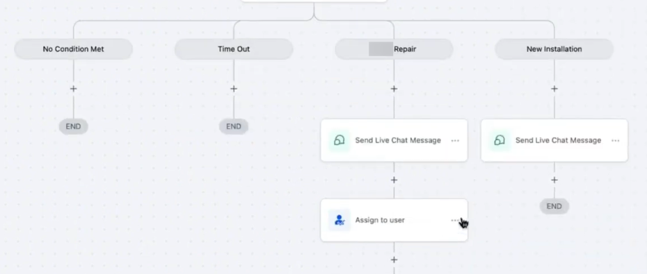 - Each branch can trigger specific responses and actions, such as assigning the conversation to a relevant team member or sending a notification to your team.