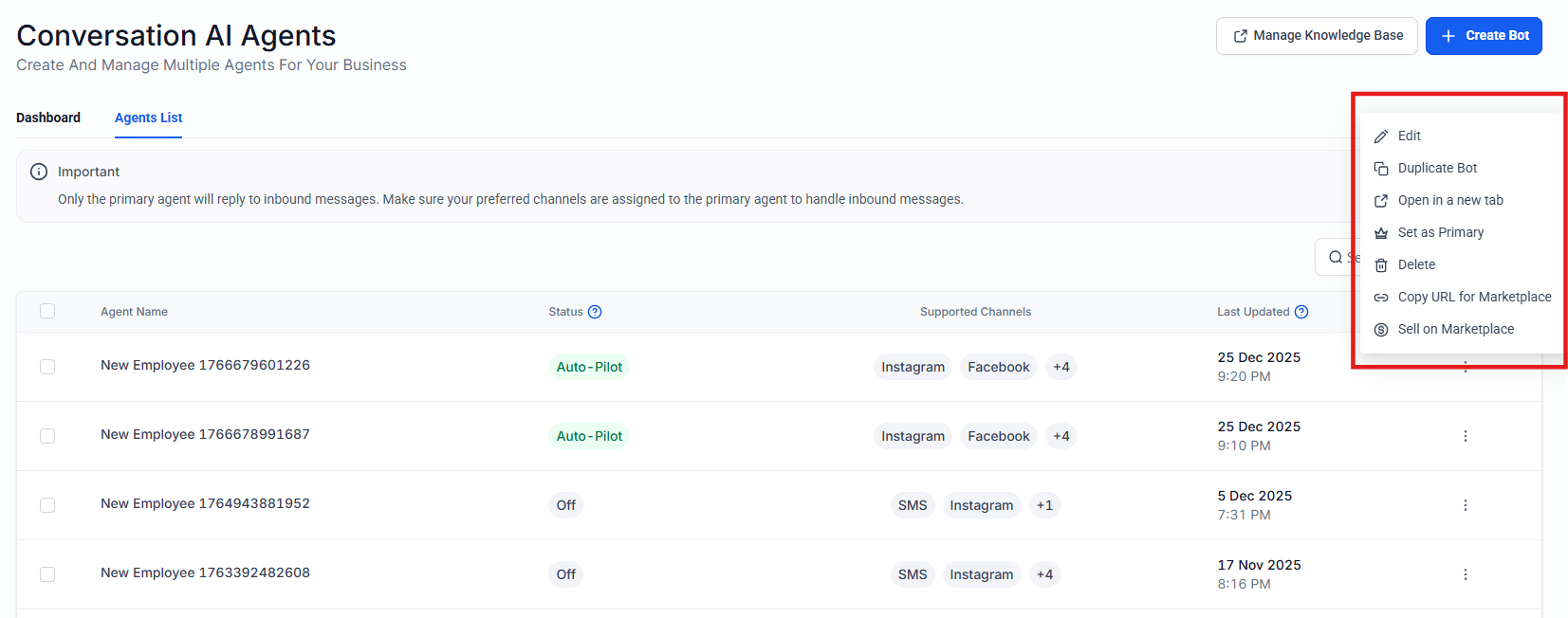 Section titled “Bot Management with Quick Actions”The Quick Action Buttons in the Bot Menu simplify bot management by enabling users to easily edit, delete, duplicate, or set bots as primary. Navigation Steps are: AI Agents (from the Dashboard menu) > Conversation AI.
