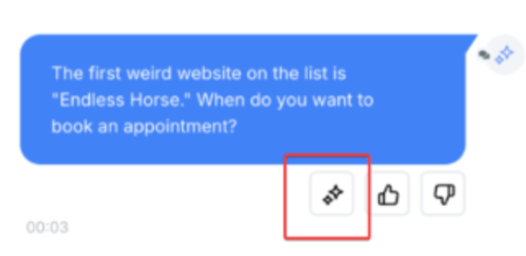 Look for the AI-generated message in the conversation. An AI icon will appear below the message to indicate that it was generated by the AI. The new window displays all relevant AI response details, including: