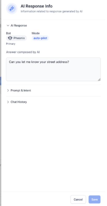 Question: How can I view the AI Response Info in a conversation? Answer: To view the AI response information, open the conversation where the AI-generated message is present. Click on the AI icon to access the details of the response, including the prompt, intent, and sources.