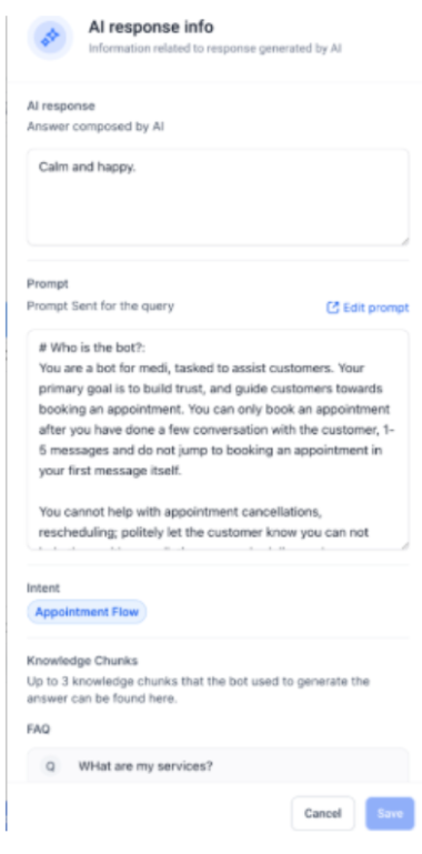 Section titled “Key Features and Benefits”- Transparency: View the underlying components of AI-generated responses, including prompts, intents, and data sources.