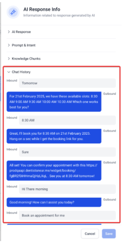- Chat History Tab: This lets users view previous conversations that were considered when generating the AI’s response. This ensures that only the relevant interactions between the bot and the user are displayed, providing clear context.