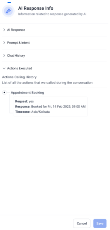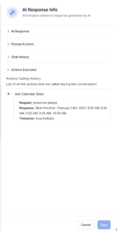 - Action Execution History: Monitor all actions triggered by the AI to generate its response, enhancing transparency and troubleshooting.