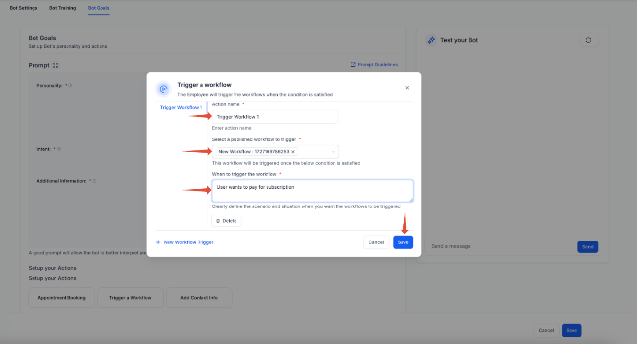 - Once the setup is complete, click Save to finalize. The bot will now automatically trigger the selected workflow when the defined conditions are met.