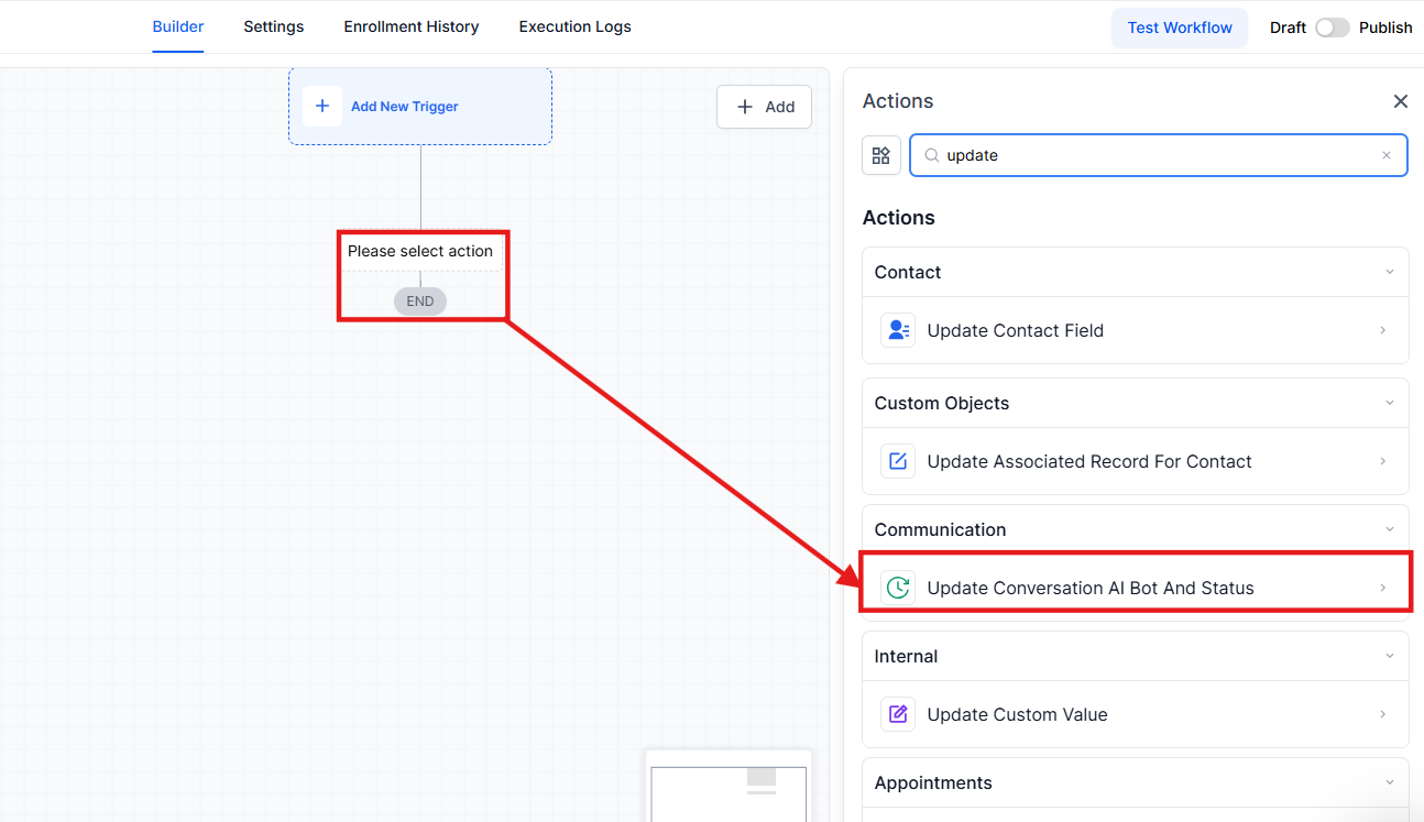 2- Add a new action and select “Update Conversation AI Bot and Status.”