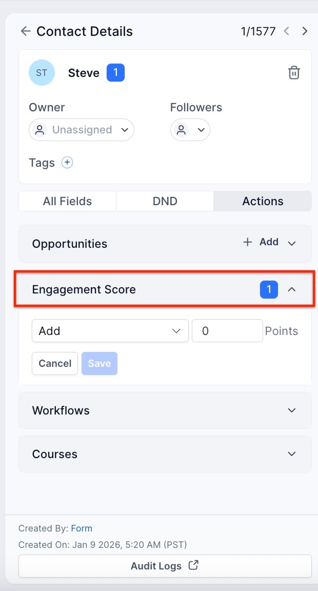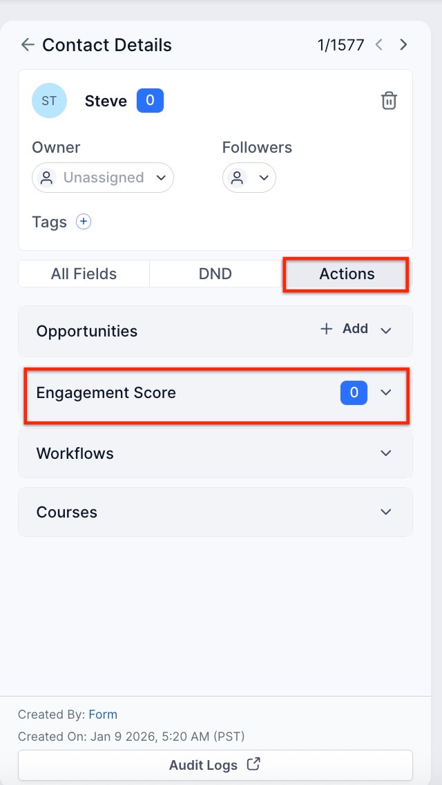 Users can easily access contact engagement scores in various areas of the platform, allowing them to quickly assess a contact’s level of interaction. Here are the two main locations where you can view these scores: