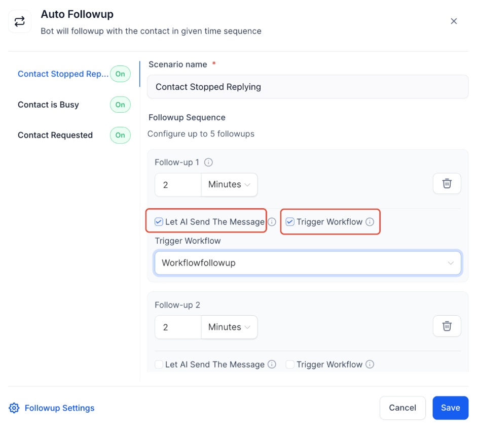 - Trigger Workflows: Integrate workflows to add tags, assign conversations, or notify users during follow-ups (without triggering another bot to maintain logic consistency).