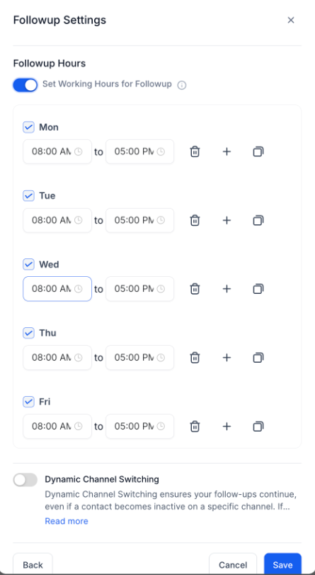 **Step 4: Set Active Working Hours (Optional)**Ensure follow-ups occur only during business hours. Messages scheduled outside these hours are deferred to the next active period.
