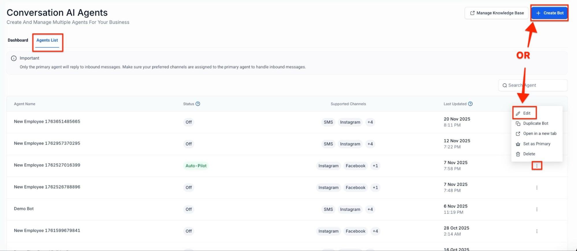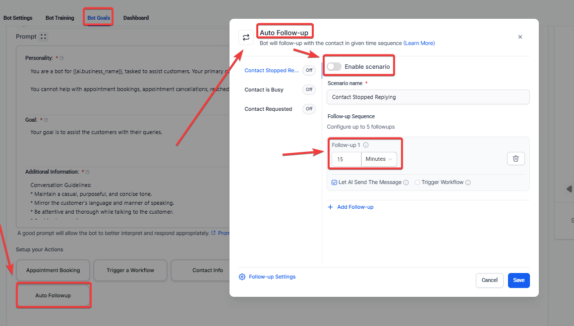 Section titled “How to Use Auto Follow-Up”Step 1: Navigate to AI Agents > Conversation AI. In the Agent List > Edit the existing or create a New Bot > Bot Goals tab.