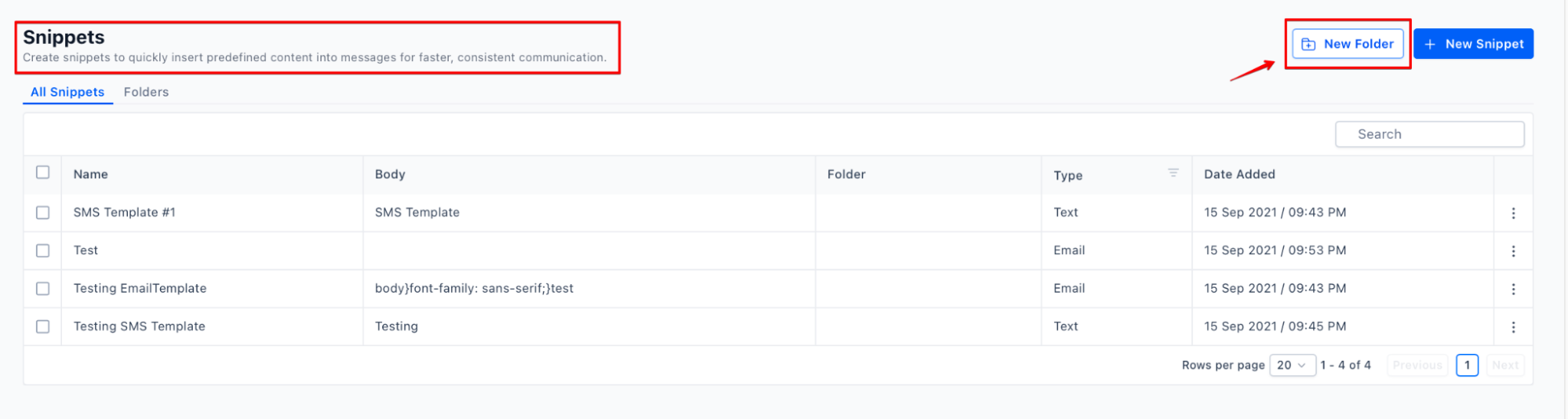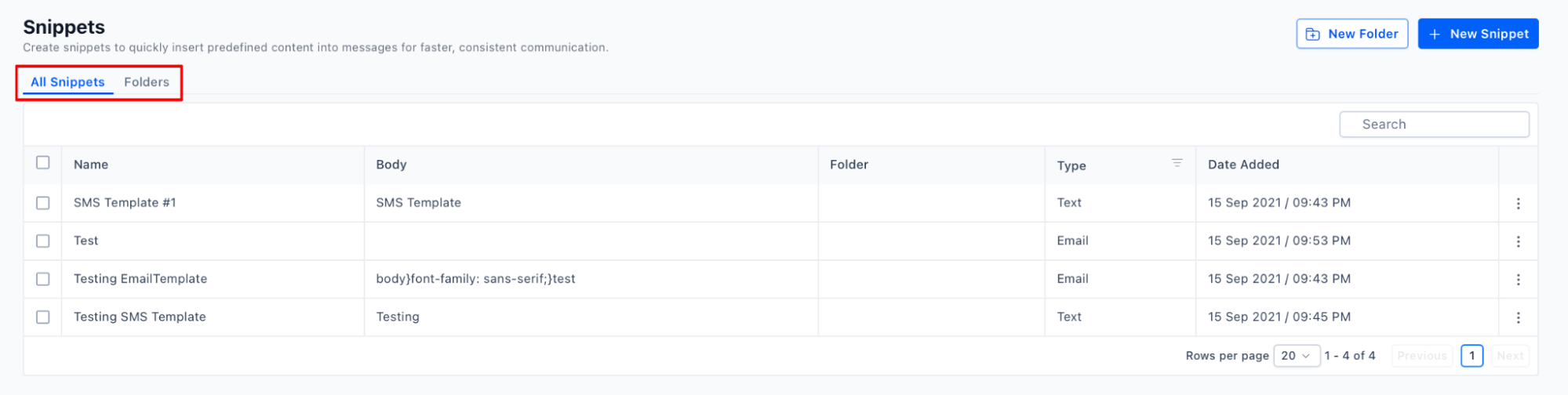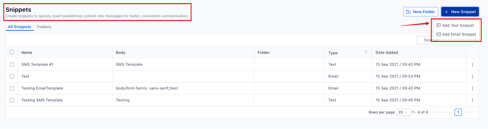 - Click on Add Snippet. Select the snippet type - Email or Text.