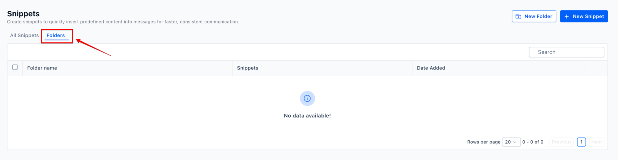 Question: How do I create a folder for organizing snippets? Answer: To create a folder, navigate to the Conversations tab in your account, click on “Snippet,” and select the “Add Folder” option. This will let you organize your snippets for faster access.