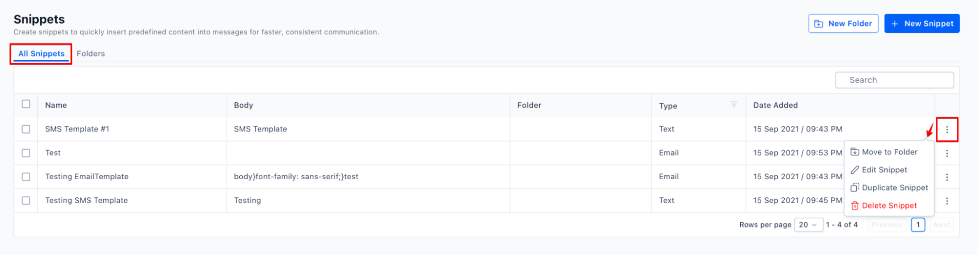 Easily find snippets by searching with their name or folder, or filter them by type—Email or Text. Use the menu icon on the right to move the snippet to a folder, edit, duplicate, or delete it.