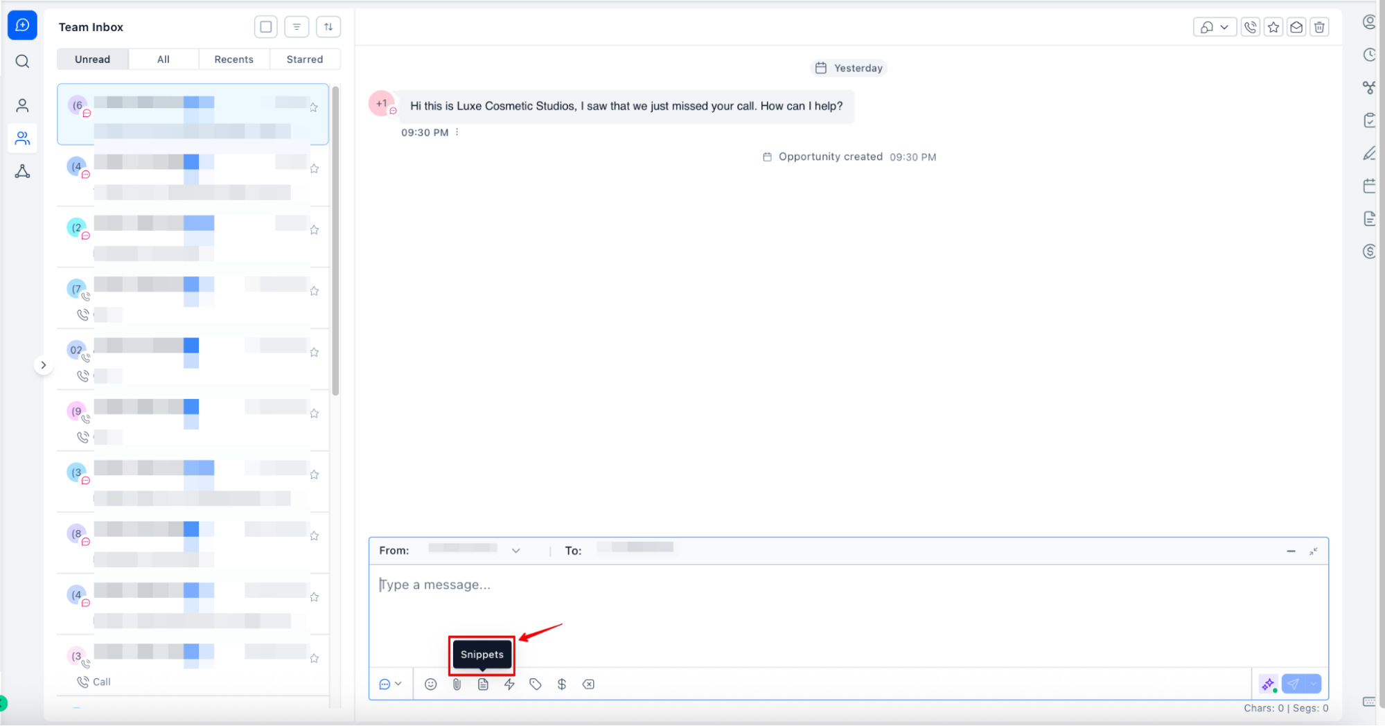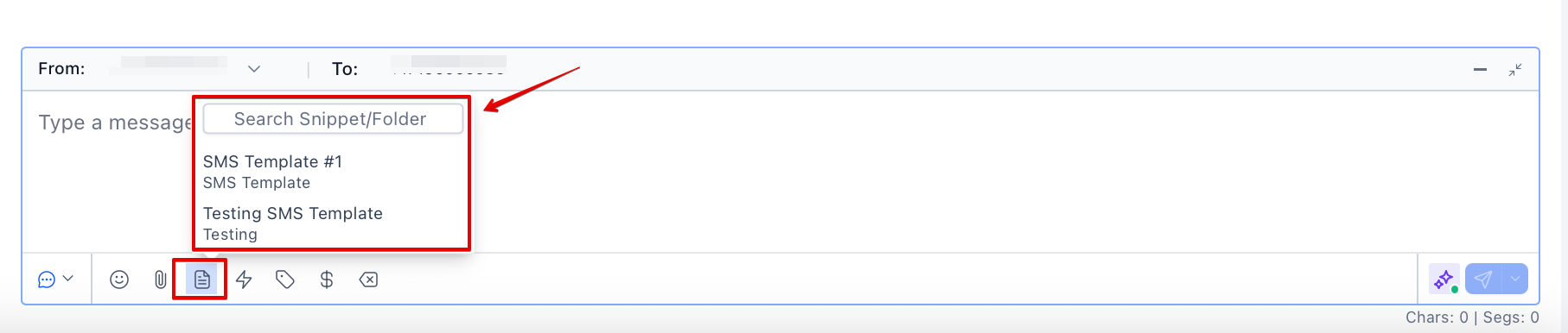 Answer: You can access your snippets directly in the Conversations tab by clicking on “Snippets.” From there, you can either search for specific snippets or navigate through folders to quickly find and insert the snippet you need.
