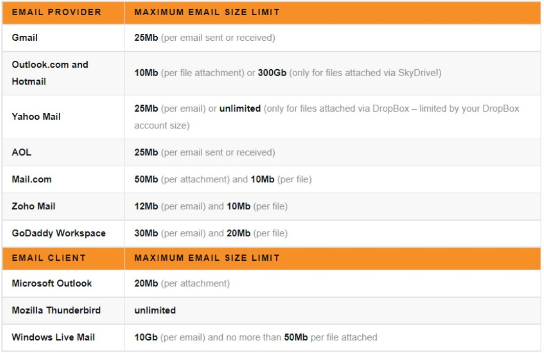 - The email providers also have limits. Here are the attachment sizes for different Email Providers: