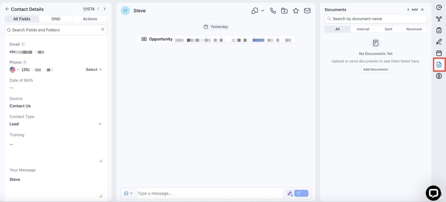 Section titled “Integrated Document Management System”Found within the Contact Details page, the “Documents” tab is your one-stop hub for all document tasks. Whether you’re looking to access a file, store it internally, or even send it via the client portal, it has got you covered.