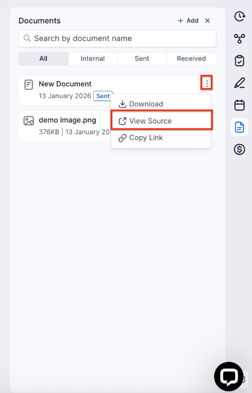 Section titled “Managing Documents”- Copy Link of Sent Document: Click the three dots next to a document and select “Copy Link” to copy the document’s link.
