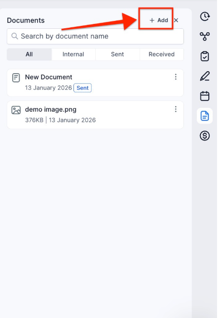- Add Internal Documents: Click the “Add” button, select “Add New File,” and drag and drop or upload files relevant to the contact. Additionally, check the box below to share the document on the Client Portal.