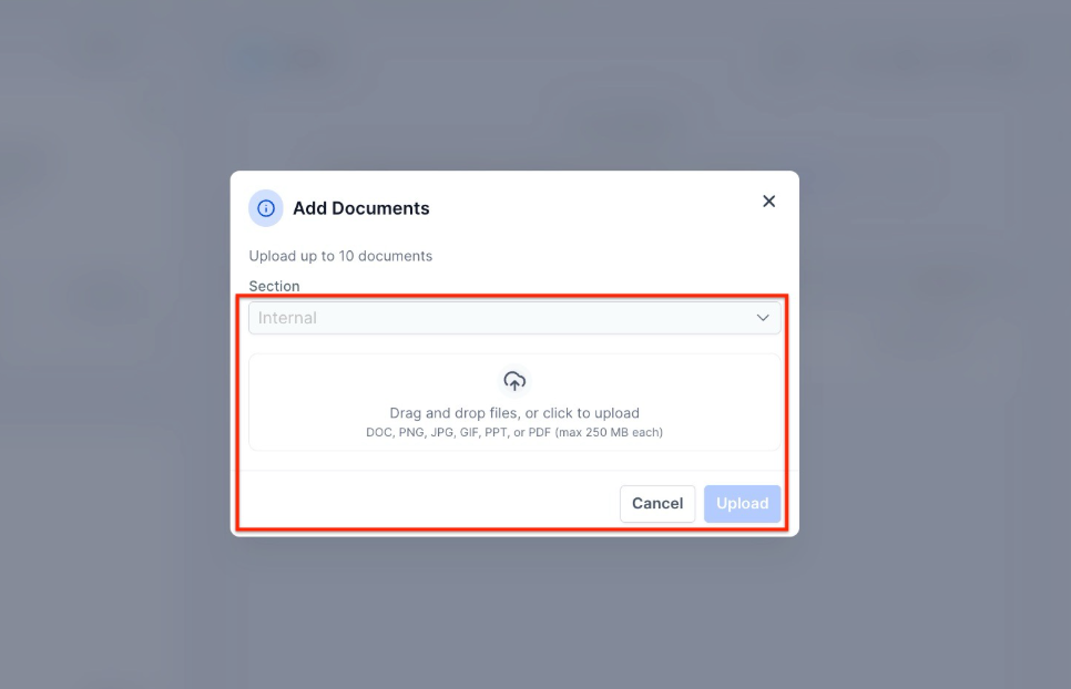 Section titled “Adding Files Made Simple”- Uploading files to the internal section has never been easier. Whether it’s a PPT, Doc, PDF, image, or even a CSV, as long as it’s under 250 MB, you’re good to go.