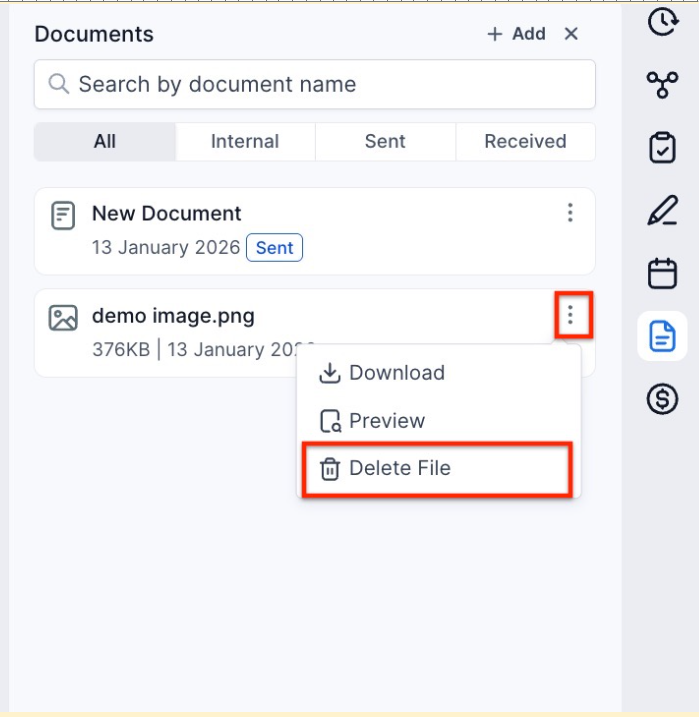 - Quick Actions: Click the three dots next to a document and choose to share/unshare the document on the Client portal, download, preview, or delete it.