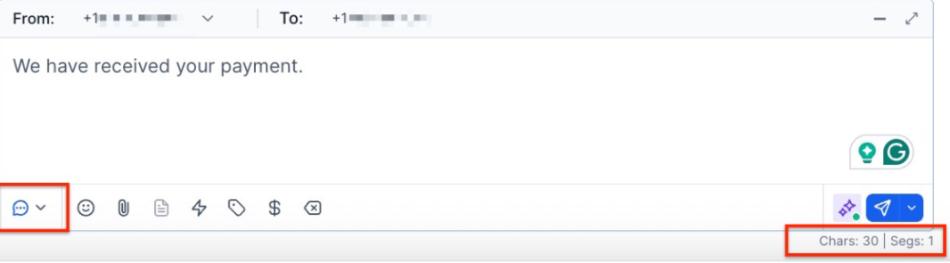 Question: How do I view SMS costs and segment information? Answer: When composing a message, the conversation composer shows the approximate character count, number of segments, and potential costs, helping you estimate SMS expenses.