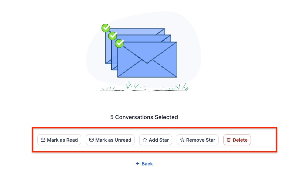 Section titled “Bulk actions (limited to 100 conversations at a time)”- Here, you can mark it as unread, read, starred (important to mark meaningful conversations, conversations to come back to, and personal categorizing), unstarred, and delete unwanted messages.