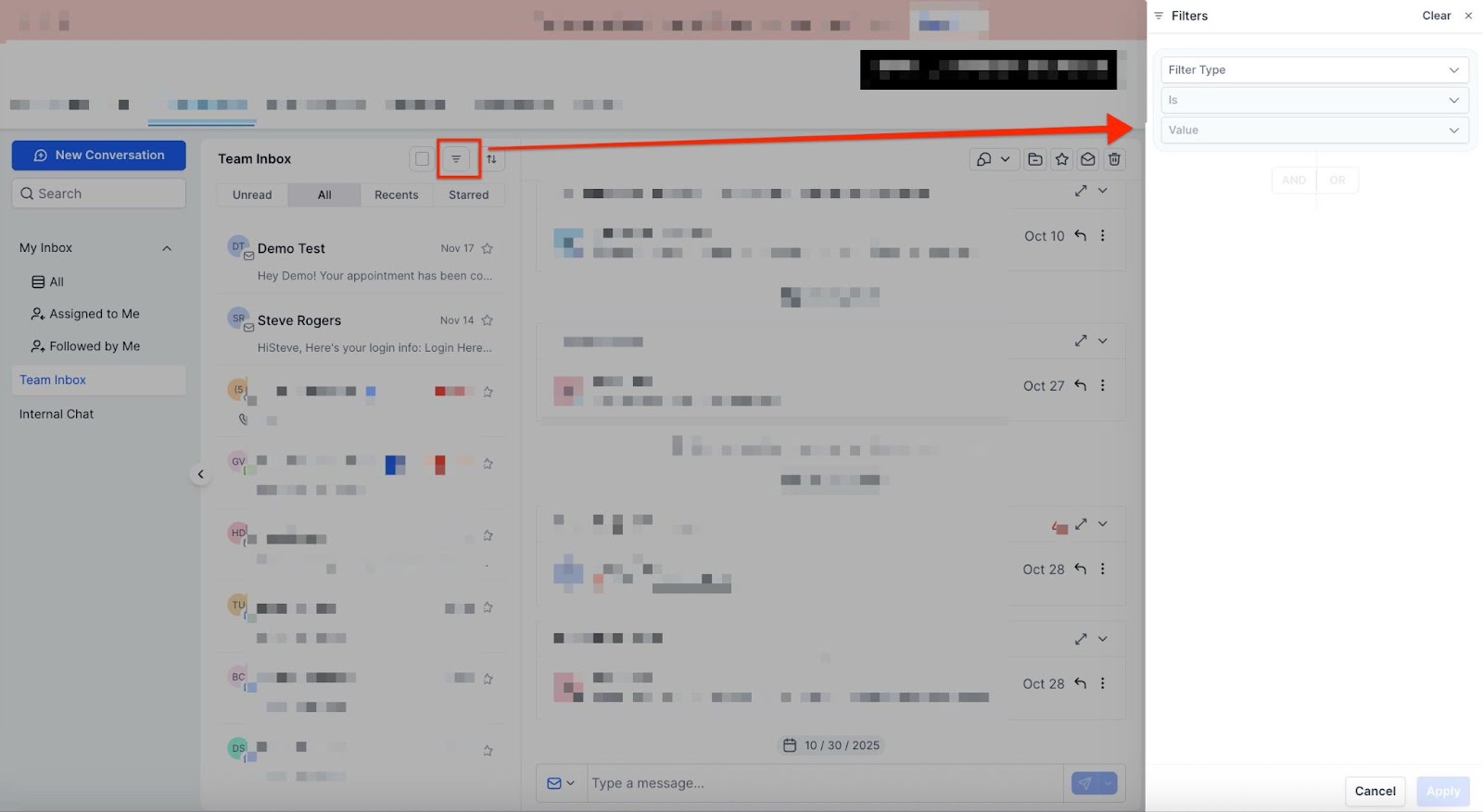 - Organization: Easily filter conversations by type, assignee, or status.