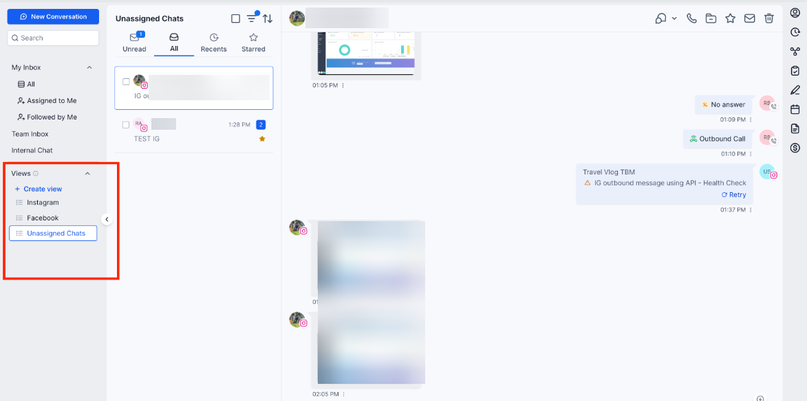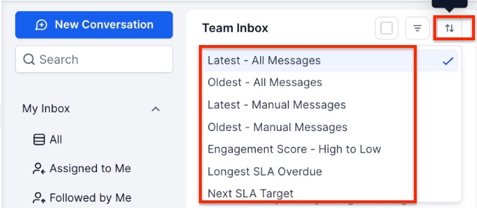 - Here, you can view messages from the Latest to the oldest or the oldest to the latest, or you can sort by the Engagement Score or SLA.