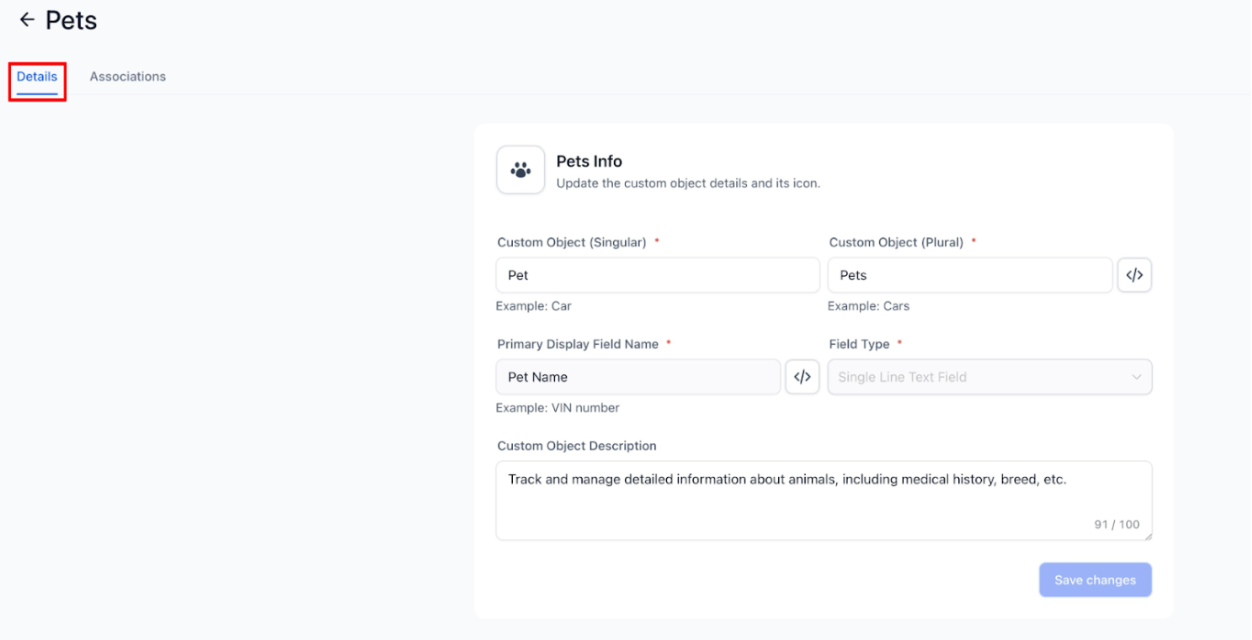 - Add a display field name to identify the object clearly (e.g., Pet Name, Pet Identification Number).