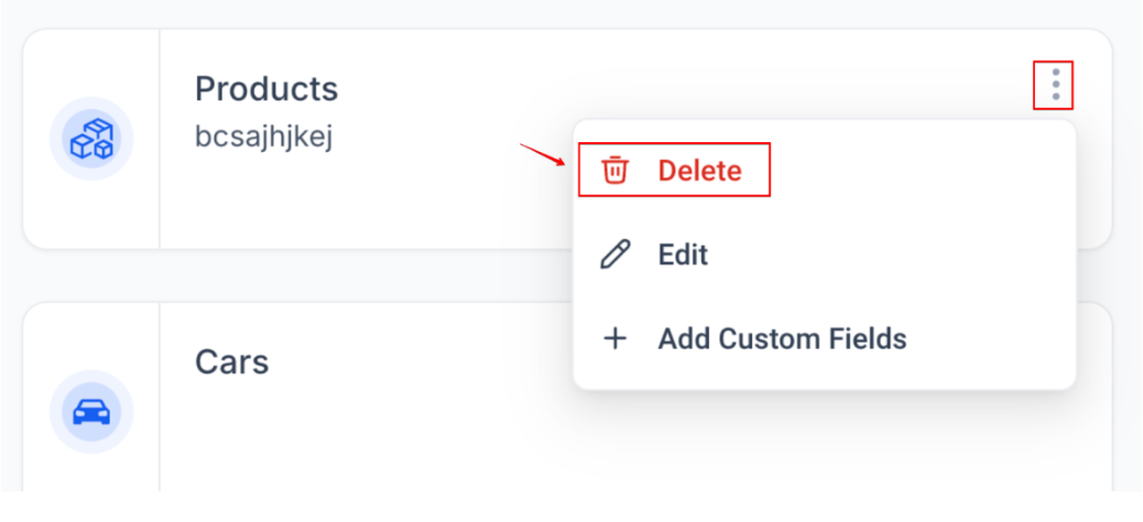 Section titled “Deleting a Custom Object”- Access the Object: Click on the 3 dots next to the custom object name.