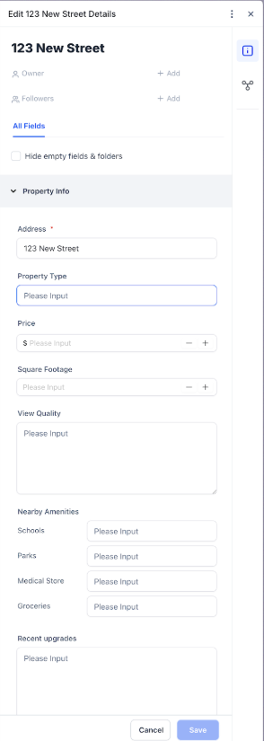 Section titled “Feature Applications”**1- Creating and Managing Property Records:**Each property can be added as a Custom Object record, with specific fields like location, property type, price, and square footage. Custom fields allow agents to capture unique property attributes, such as view quality, nearby amenities, and recent upgrades.