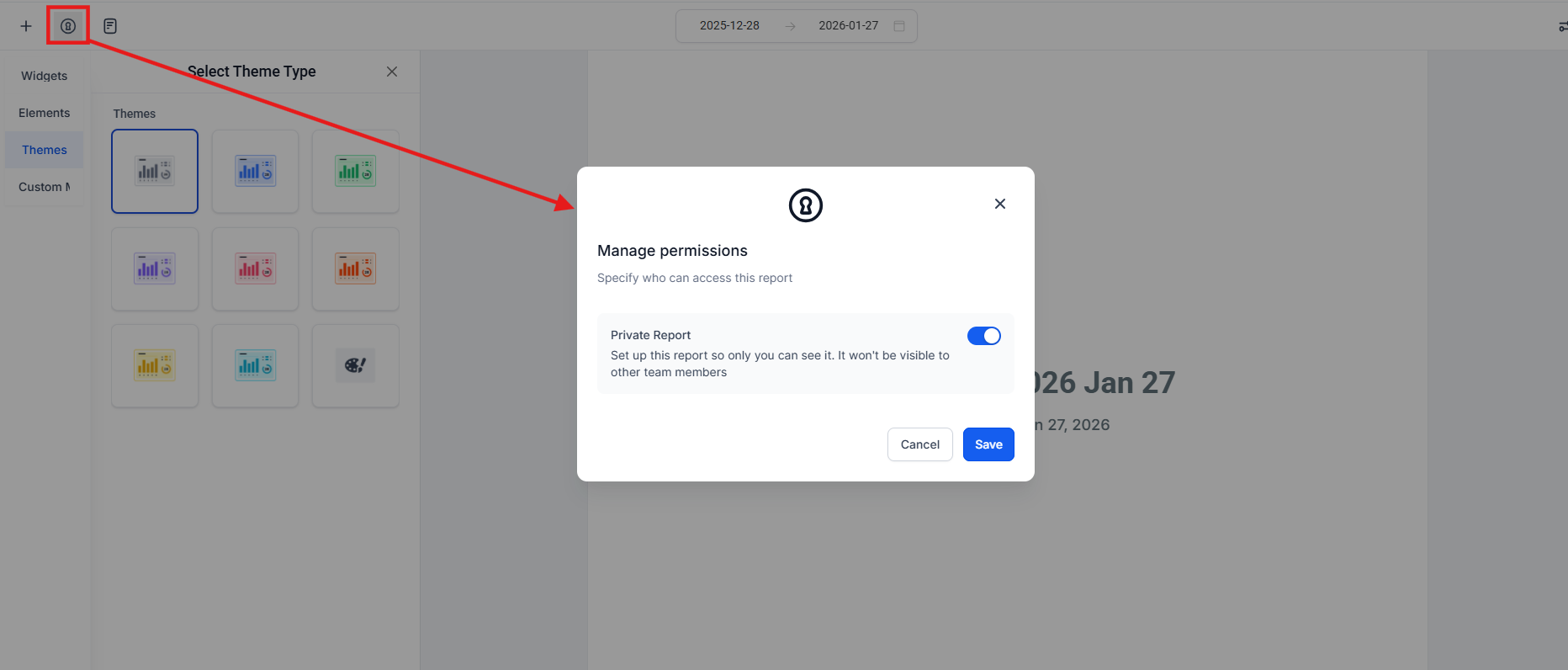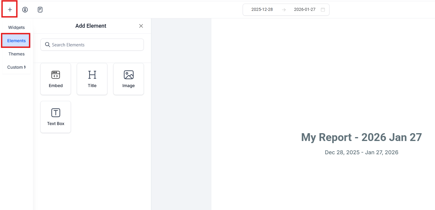 Section titled “4. Add Themes to Reports:”- Open the Report Builder and click the + icon.