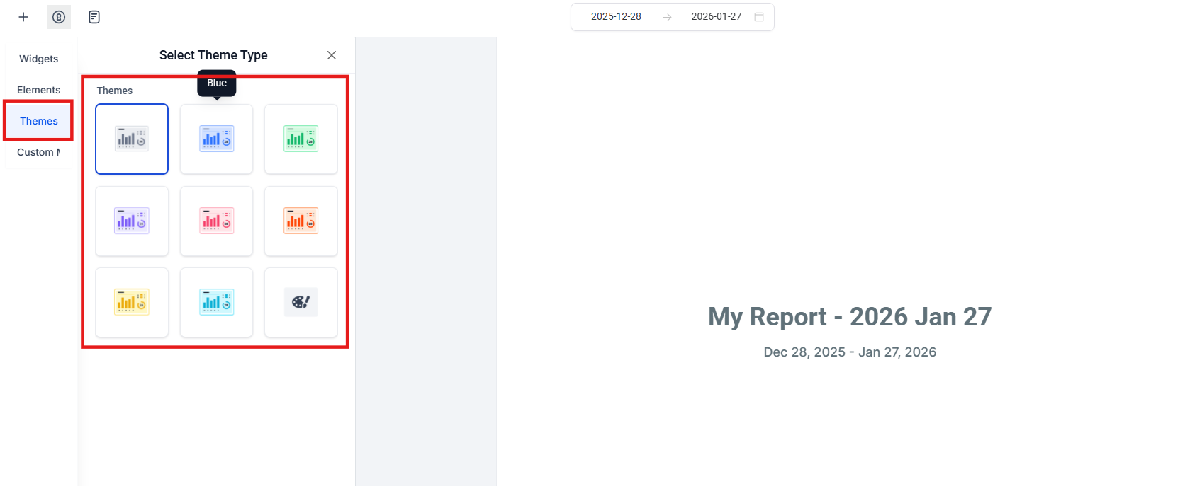 - Themes apply seamlessly across the entire report or individual widgets.