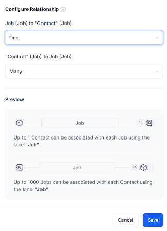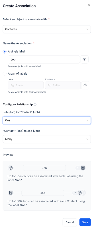 Section titled “Limitations:”- You can create up to 10 association labels between two contacts or a contact and a custom object combination.
