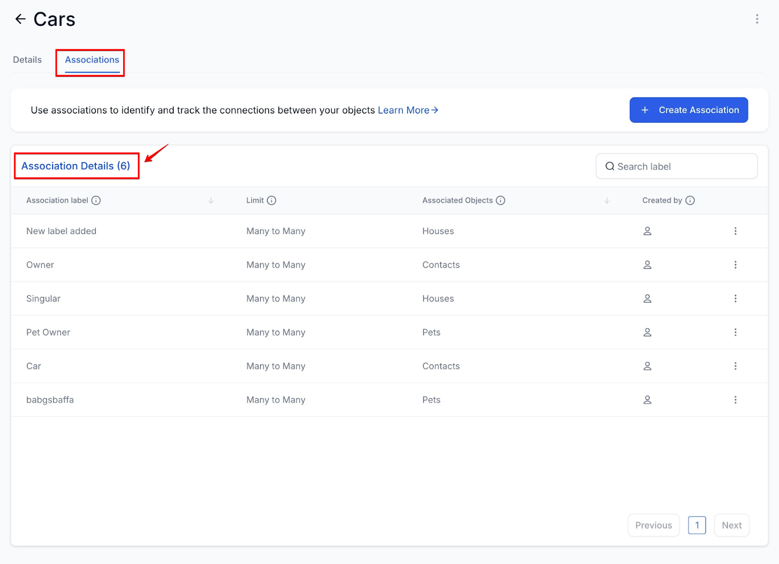 Section titled “Creating Associations”Associations allow you to establish a connection between custom objects and contacts or between two custom objects. To create associations, follow these steps: