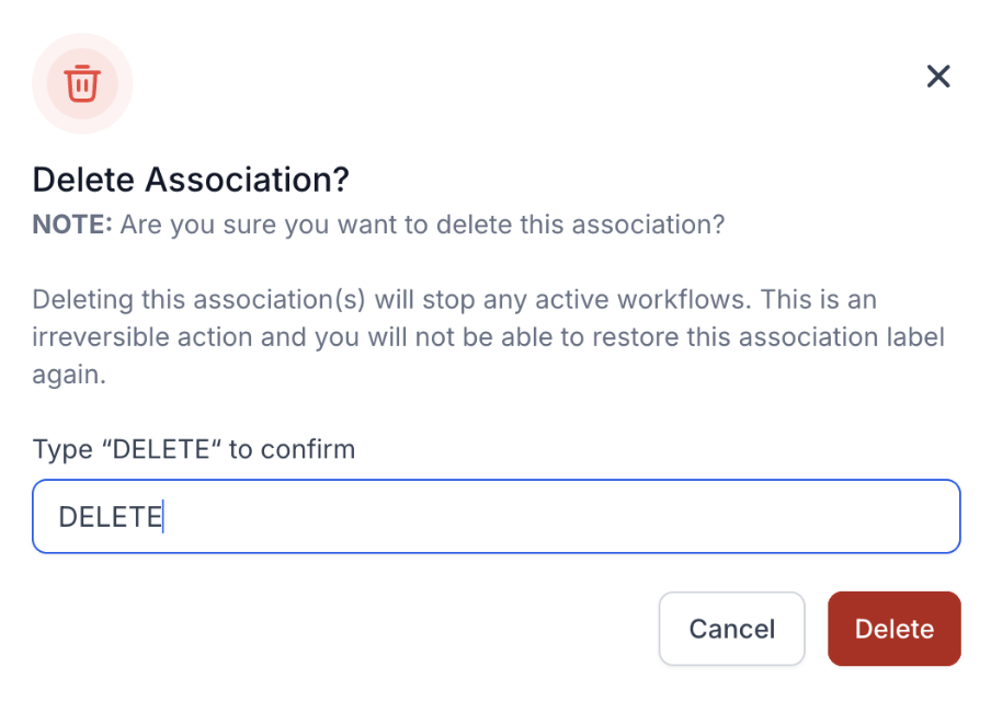 Note: Deleting an association is only possible if there are no existing relationships between two different records using the mentioned label.