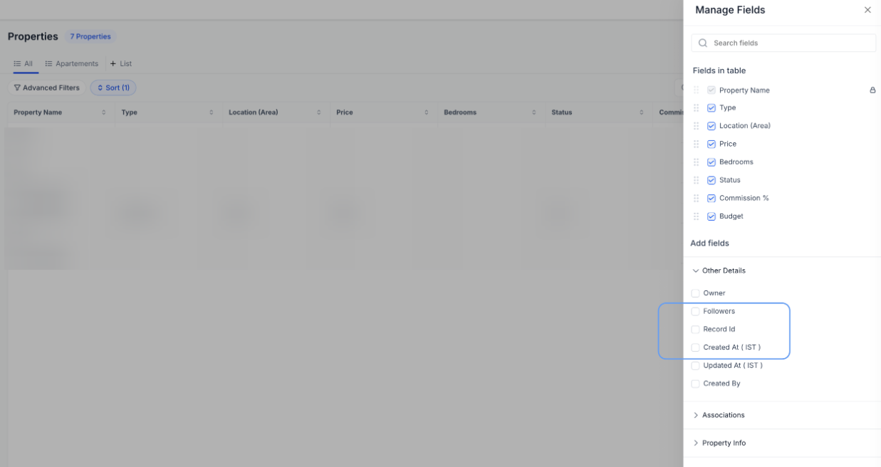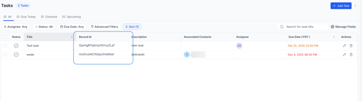 Section titled “Step 2: Record IDs in Lists & Record Details”List View: You can add Record ID as a column via Manage Fields. It’s disabled by default to keep your list view clean unless you choose to enable it.