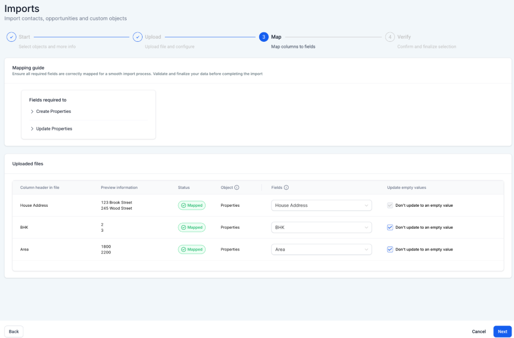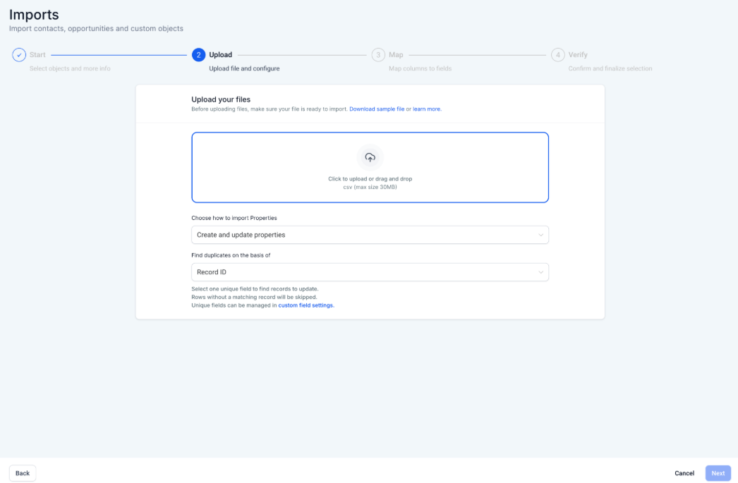 Section titled “Step 3: Bulk Import for Custom Objects”You can bulk import Custom Object records using the same create and update process available for Contacts and Opportunities.