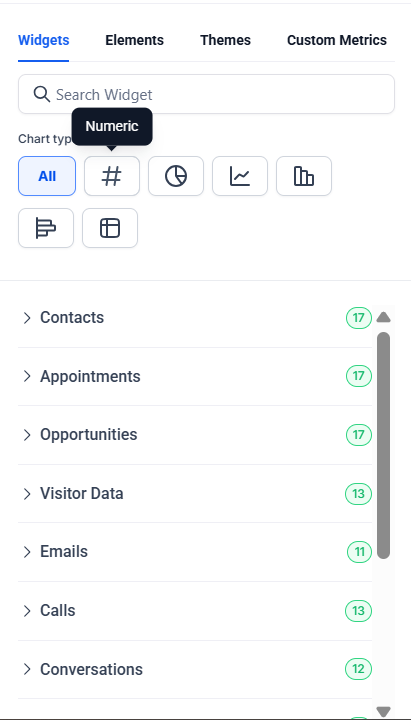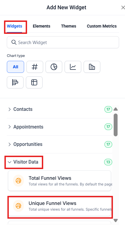 - Adjust Widget Titles: Rename widgets for clarity, like “Total Confirmed Appointments” or “Top Performing Funnels.”