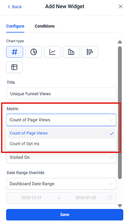 - Set the Metric to Unique Funnel Views to focus on individual visitors rather than total visits.
