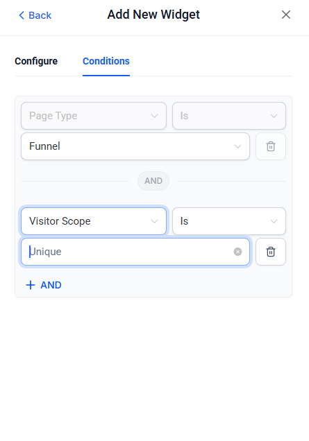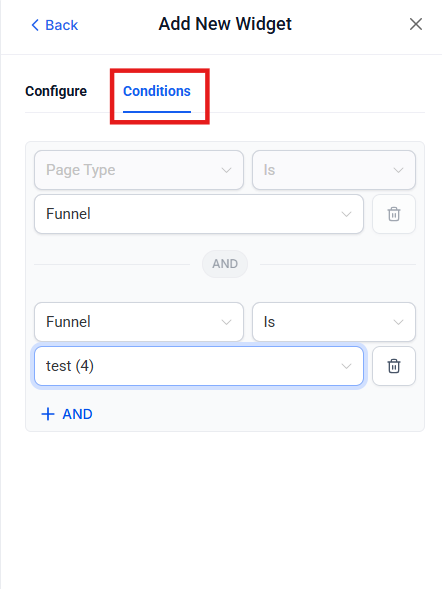 Question: How do I track specific funnels in my dashboard? Answer: You can track specific funnels by adding conditions to your widgets. In the widget settings, you can choose the specific funnel you want to analyze from a dropdown menu, ensuring the data displayed is focused on that particular funnel.