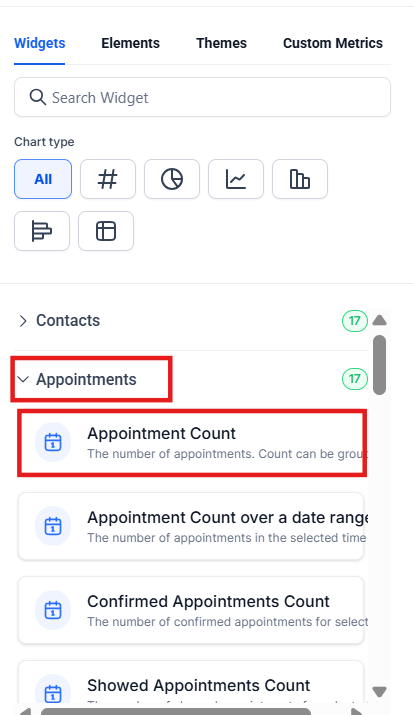 - Choose the “Appointment Count” metric to track the total number of appointments across your selected criteria.