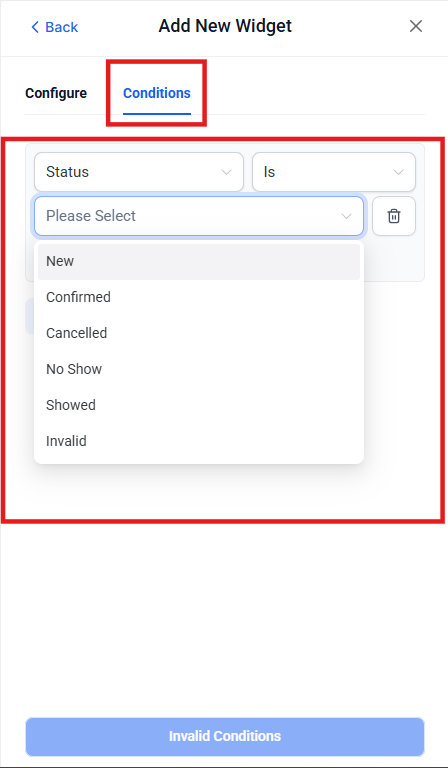 Section titled “Apply Conditions to Filter Data”- Scroll to the Conditions section to refine the data shown in the widget.